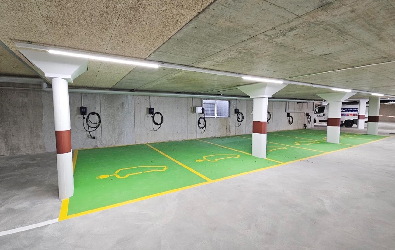 Die Gemeinde Richterswil beauftragte die EGZ mit der Realisierung einer öffentlichen E-Ladeinfrastruktur in der Tiefgarage eines neuen Feuerwehr- und Kindergarten-Gebäudes. Wir haben die Gemeinde in der Wahl der Ladestationen und der geeigneten Abrechnungslösung beraten. In einem zweiten Schritt durfte die EGZ auch die Realisierung bis zur Inbetriebnahme übernehmen. Für einen sicheren und günstigen Zahlungsprozess fiel die Wahl auf das Abrechnungssystem «eCarUp». Seit 1. Dezember 2025 stehen in der Tiefgarage im Dorfzentrum nun 7 Parkplätze mit AC-Ladestationen (max. 22 kW) zur Verfügung.